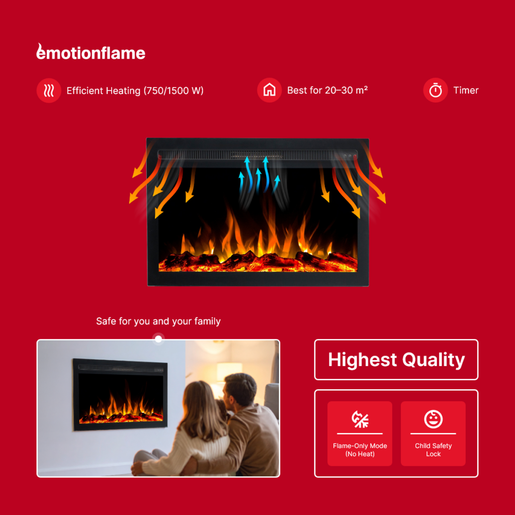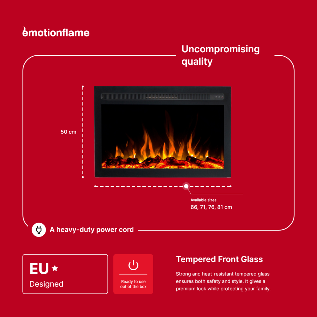The Emotion Flame Infinity fireplace insert is a modern solution that combines elegance, functionality, and ease of use. It fits perfectly into a wall or alcove, creating the effect of a real fireplace – without smoke, ash, or the need for maintenance. It’s the perfect choice for those who value warmth and a cozy atmosphere in a stylish way.