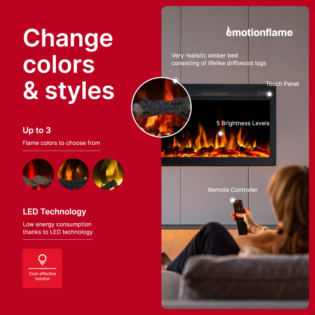• Colorful LED flames (3 colors) – a realistic fire effect in warm and cool shades, perfect for any season.